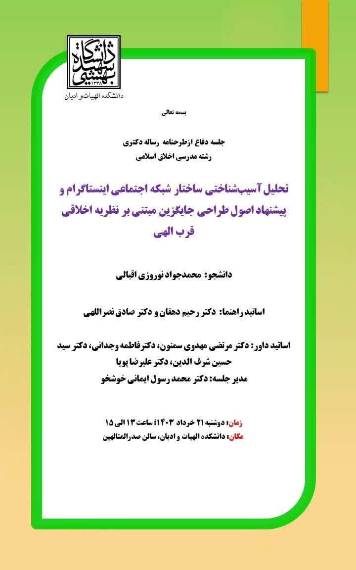 ✅ جلسه دفاع از طرحنامه رساله دکتری تحلیل آسیب شناختی ساختار شبکه اجتماعی اینستاگرام و پیشنهاد اصول طراحی جایگزین مبتنی بر نظریه اخلاقی قرب الهی