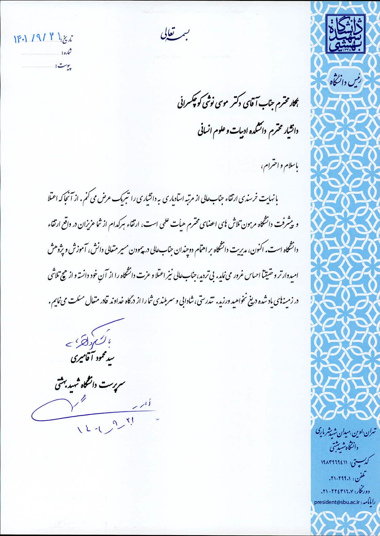 دکتر سید محمود آقامیری، رئیس دانشگاه شهید بهشتی، با ارسال پیامی ارتقاء مرتبه علمی دکتر موسی نوشی کوچک سرایی، عضو هیات علمی دانشکده ادبیات و علوم انسانی را از استادیاری به دانشیاری تبریک گفت. متن پیام به شرح زیر است:
