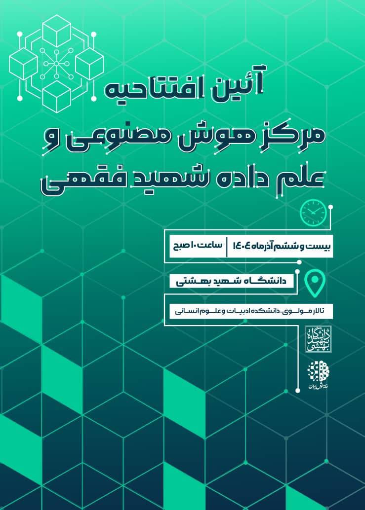 آیین افتتاحیه مرکز هوش مصنوعی و علم داده شهید فقهی روز بیست‌وششم آذرماه ۱۴۰۴ با حضور اساتید، پژوهشگران و علاقه‌مندان حوزه هوش مصنوعی و علم داده در دانشگاه شهید بهشتی برگزار می‌شود. این رویداد با هدف توسعه فعالیت‌های میان‌رشته‌ای، ارتقای ظرفیت‌های پژوهشی و تقویت زیست‌بوم علمی در حوزه‌های هوش مصنوعی و علم داده برنامه‌ریزی شده است.